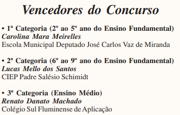 Um grupo de jurados que envolveu intelectuais da Academia de Letras de Vassouras, professores da Secretaria Municipal de Educação e da Coordenadoria Regional de Educação escolheu os vencedores nas categorias 2º ao 5º ano do Ensino Fundamental, 6º ao 9º ano do Ensino Fundamental e Ensino Médio. Estudantes, familiares e representantes das escolas participaram do evento no Galo Vermelho.