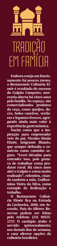 A mistura equilibrada de especiarias, legumes, grãos, carnes e laticínios transforma a gastronomia árabe em uma experiência rica em sabores e aromas. Em Paty do Alferes, essa tradição ganha espaço no Restaurante Culinária Árabe, da família Elmôr, localizado em Campo Verde, cenário que une natureza e boa mesa.