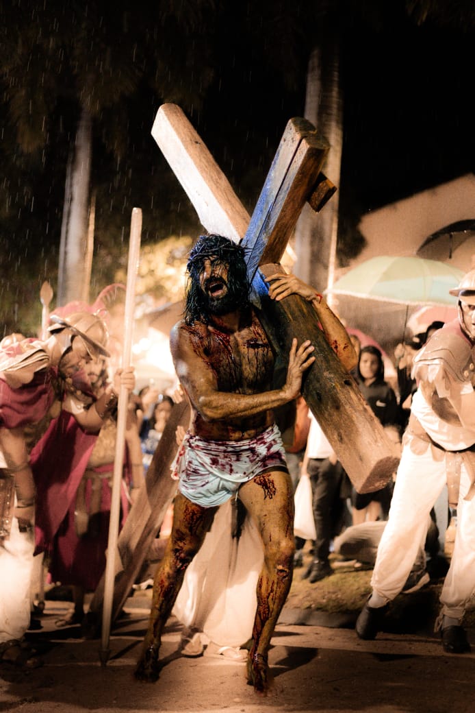 Portanto, a Paixão de Cristo nasce, dessa vontade de homenagear essas mulheres da minha vida. O padre José Antônio, na época, abraçou o projeto, investiu tempo e energia conosco e fez acontecer; mesmo que com poucos recursos financeiros, realizamos como foi possível; nos primeiros anos, dentro da igreja, apesar do projeto ter sido pensando desde o início para acontecer na praça. Na época, compartilhei com uma grande amiga, Bia Oliveira, a vontade de criarmos essa paixão, e ela foi outra também que, junto com outros trinta atores, abraçaram o projeto e fizeram acontecer. Portanto, são muitas pessoas envolvidas e responsáveis por este projeto chegar onde chegou. Mas, o grande criador mesmo e o responsável foi nosso pai Deus.