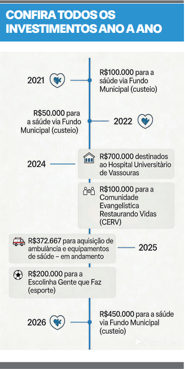 Os repasses por meio de emendas parlamentares têm apresentado crescimento progressivo ao longo dos anos, consolidando uma atuação contínua no município. Para 2026, já está previsto o envio inicial de 450.000 mil reais para custeio da saúde via Fundo Municipal. Os recursos têm contribuído para reforçar o atendimento à população, garantir equipamentos, ampliar a capacidade de resposta da rede municipal e assegurar mais dignidade no acesso à saúde.