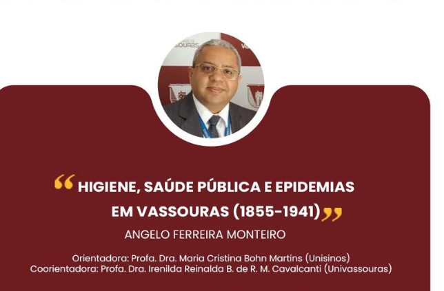 No dia 10 de outubro de 2025, o professor da Univassouras Angelo Ferreira Monteiro defendeu a tese intitulada “Higiene, Saúde Pública e Epidemias em Vassouras (1855–1941)”, no âmbito do Programa de Pós-Graduação em História da Universidade do Vale do Rio dos Sinos (PPGH/Unisinos), realizado em parceria com a Universidade de Vassouras, por meio do Programa de Cooperação Interinstitucional de Doutorado (PCI/DINTER) em História. A pesquisa foi aprovada com distinção e recebeu indicação para publicação, em razão do ineditismo das fontes e da relevância do tema na interface entre História e Saúde.