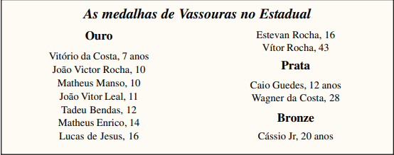 Vassouras conquistou nada menos que doze medalhas no Campeonato Estadual de Jiu Jitsu, realizado no domingo, 2 de abril, no Iate Clube Jardim Guanabara, Ilha do Governador, zona norte do Rio. Representada por dezesseis atletas, a equipe vassourense conquistou nove medalhas de ouro, duas de prata e uma de bronze. Atletas da cidade disputaram as categorias mirim, infantil, juvenil, adulto e sênior.