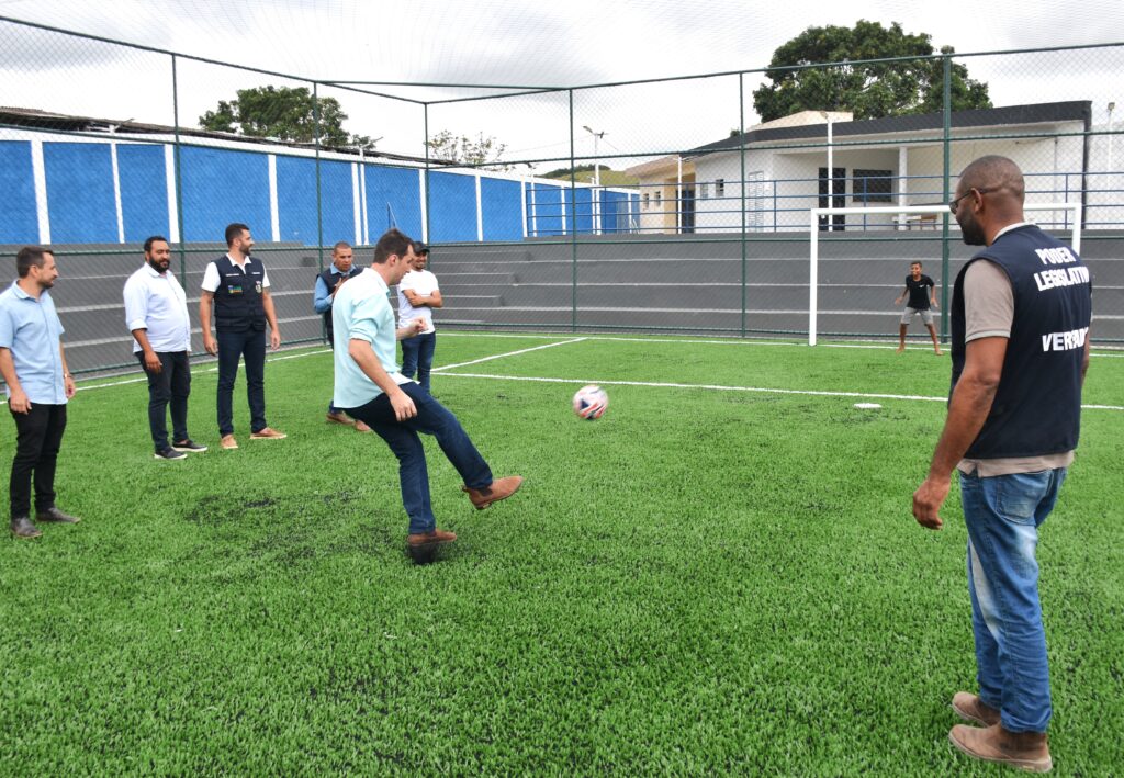 Mais tarde naquele dia, a comunidade da Granja Califórnia também foi contemplada no pacote de entregas. A Praça Noêmia Rosa recebeu melhorias, como nova pintura e paisagismo, e a troca da grama sintética da quadra, promovendo mais conforto para os usuários do espaço.