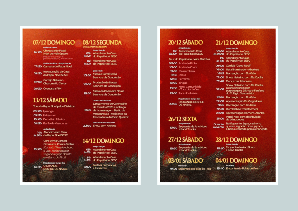 O ponto alto da programação será o Grande Desfile de Natal, que acontecerá em duas datas, 13 e 20 de dezembro, sempre na Praça Barão de Campo Belo. A parada natalina contará com carros alegóricos iluminados, alas coreografadas, personagens clássicos, figurinos exclusivos e efeitos especiais — consolidando Vassouras como vitrine regional do período festivo.