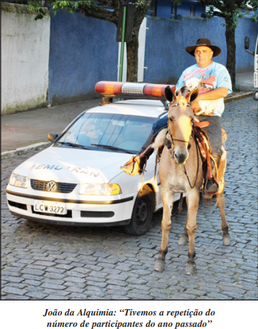 Um domingo de sol e muito calor, apesar do outono, saudou a 49ª edição da Cavalgada de São Jorge, que tomou conta das ruas de Vassouras no 1º de Maio. Organizador da Cavalgada, João Carlos da Rocha Barbosa admitiu o que muita gente notou durante o trajeto: a procissão passou mais rápido que em anos anteriores. “O motorista do caminhão não tinha experiência e acabou conduzindo a procissão mais rápido do que deveria”, admitiu.