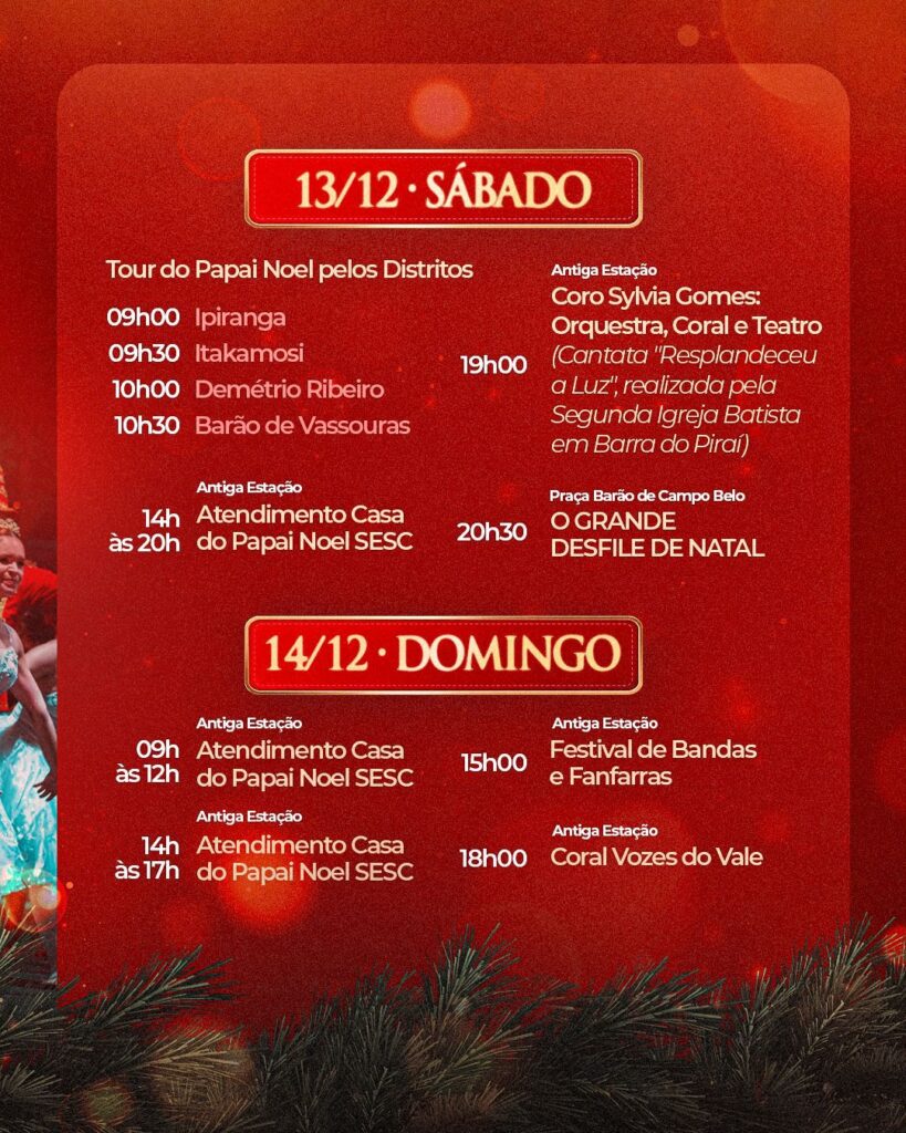 Neste fim de semana, Vassouras segue com sua programação especial do Natal Luz do Vale, com atrações que prometem movimentar a cidade e envolver moradores e visitantes no clima natalino.